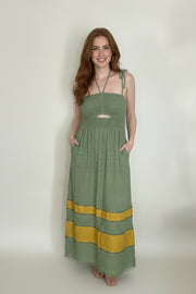A smocked bodice offers gentle structure with flexibility, creating a fit that adapts to your shape rather than restricting it. Adjustable shoulder ties let you customize how the dress sits on your frame, while a subtle front cutout adds just the right amount of intrigue — thoughtfully placed, never overpowering. The flowing maxi-length skirt moves with ease, creating a silhouette that feels feminine, confident, and relaxed all at once.
