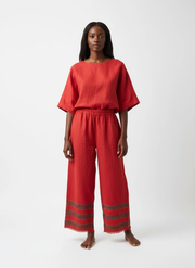 Finished with our signature tilet-inspired hem — woven in rich greens and earth tones — the Rahel Pants bring a touch of Ethiopian heritage to any outfit. Pair them with the matching top for a monochrome set, or mix and match with your favorite basics for effortless, elevated style.