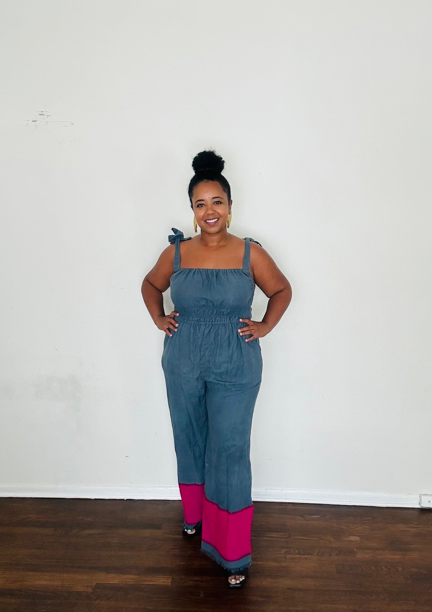 Inclusive in fit, the Sebie Jumpsuit drapes beautifully across sizes Small through Large. Each piece is finished with a bold pop of color along the hem, a signature detail that makes your jumpsuit unmistakably unique.
