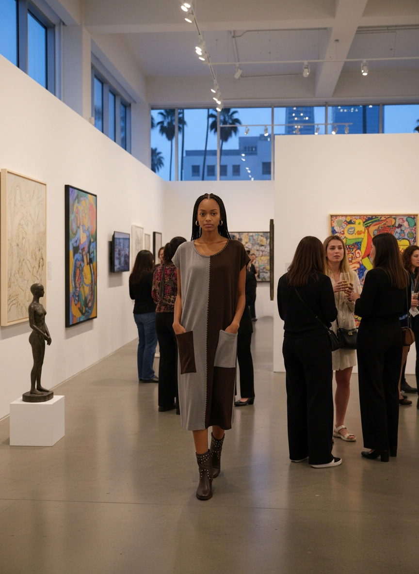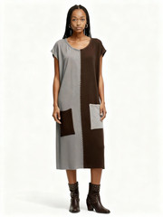 Elevated simplicity meets artisan heritage in the Sena Dress — a versatile two-tone silhouette handcrafted in Ethiopia from soft, breathable cotton. Designed with balance and ease in mind, the dress features a striking stone grey and cacao brown color block, joined by hand-stitched detailing that runs down the center. Two front patch pockets add both function and character, while the relaxed fit ensures effortless movement and comfort.