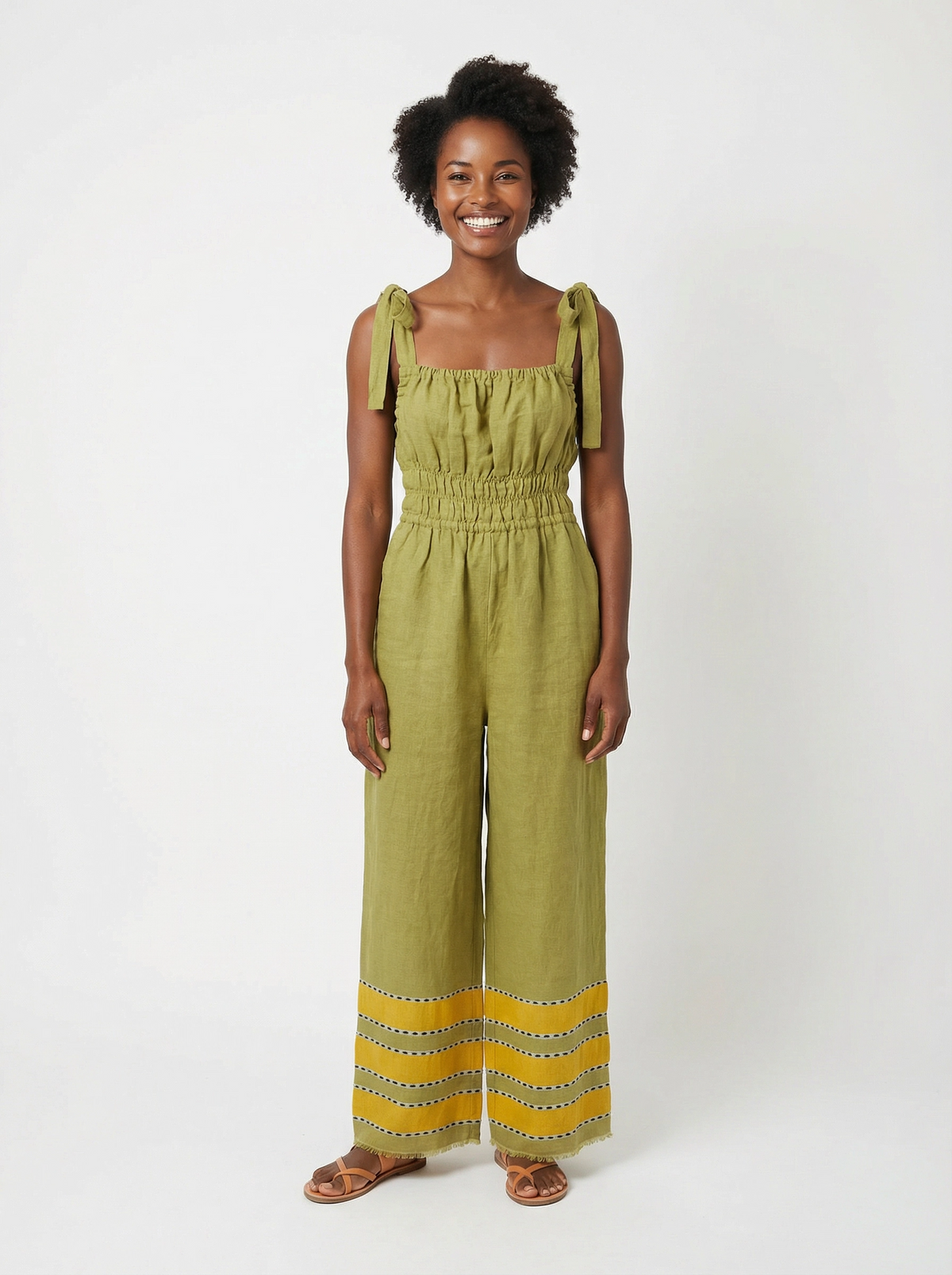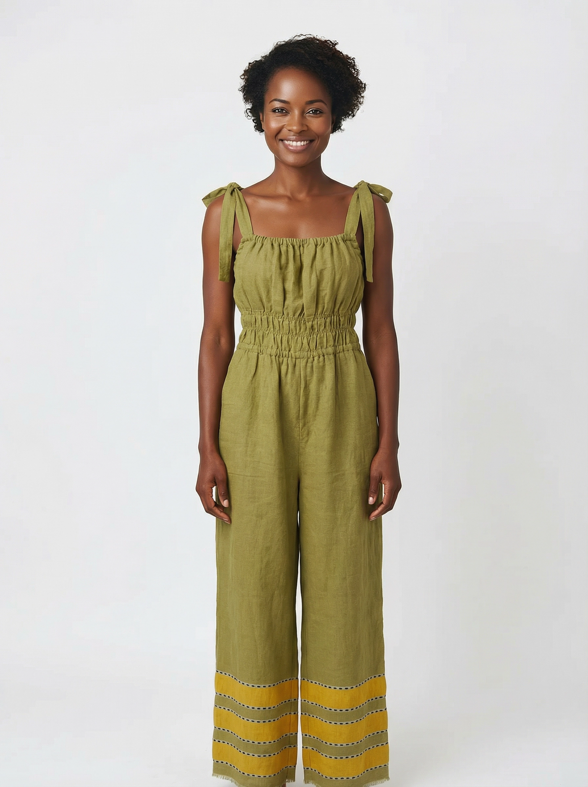 Handmade in Ethiopia from 100% natural cotton, each piece is truly one of a kind. This cinched waist jumpsuit shapes gently through the middle, drapes with an easy flow, and feels soft on skin. Adjustable straps let you style the neckline your way, and deep pockets keep essentials close. Finished with our signature pop-color hem, it’s the jumpsuit you’ll reach for from beach mornings to city nights.